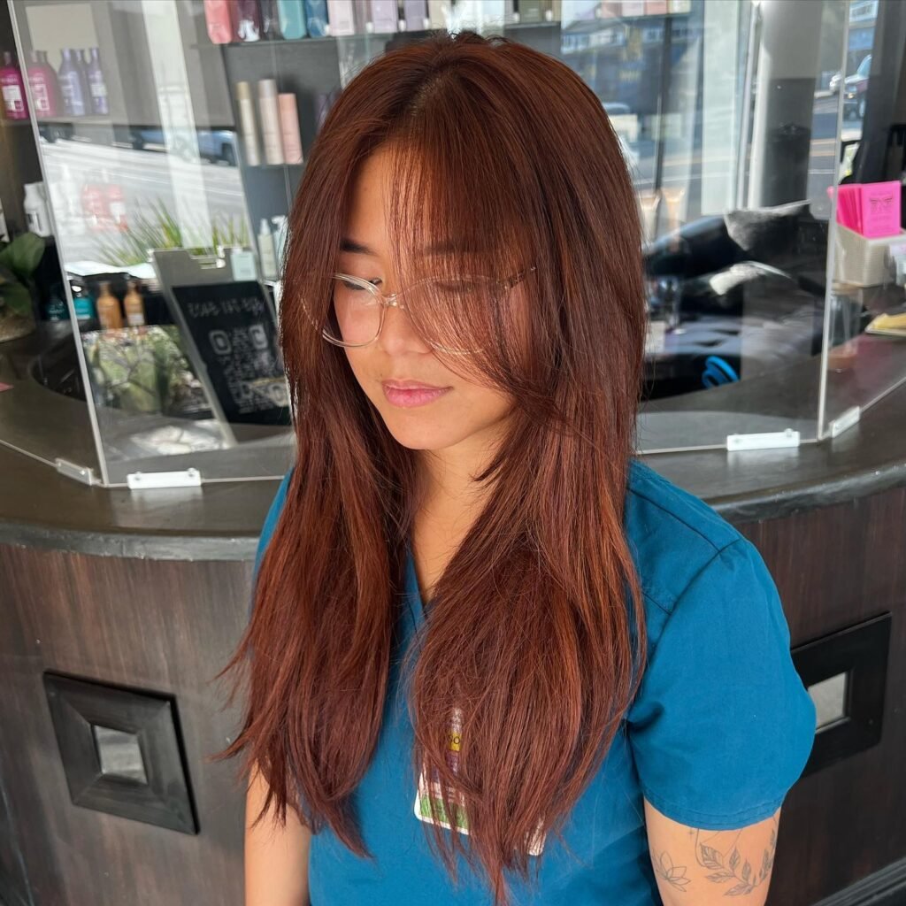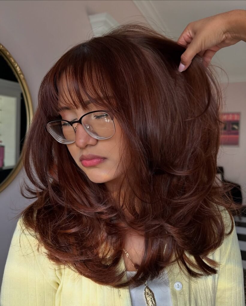 Pairing auburn brown hair with bangs adds a playful and youthful vibe. The warm tones frame the face beautifully, highlighting your features. It’s a chic and stylish way to stand out.