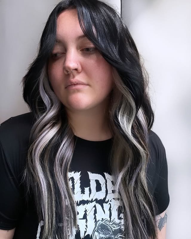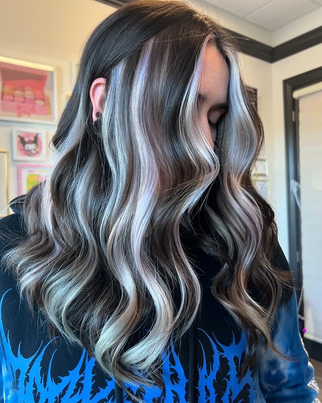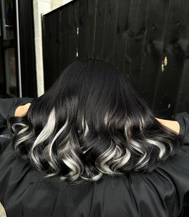 Adding white highlights to black hair brings brightness and depth to your locks. The streaks create a bold contrast that catches the light beautifully. It’s a modern way to refresh classic black hair.