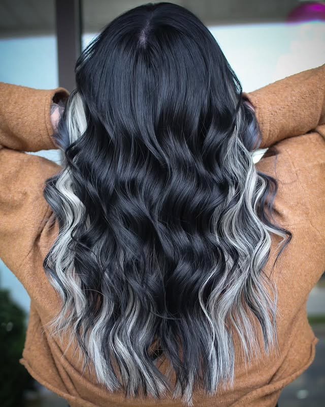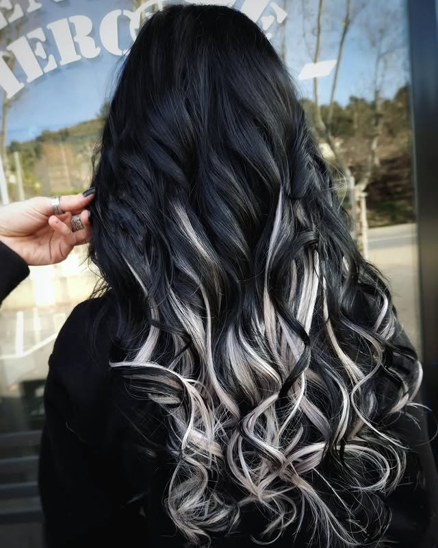 Balayage in black and white creates a natural, blended style with high impact. The hand-painted technique makes the shades flow seamlessly. It’s a fashionable choice for long hair lovers.