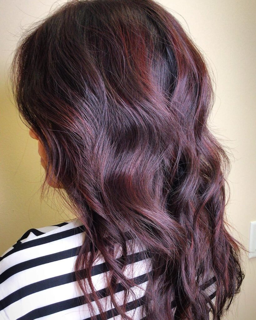 Balayage and highlights in cherry coke tones add stunning depth. The layered hues create a multidimensional effect that looks natural yet bold. These gorgeous ideas are full of movement and shine.