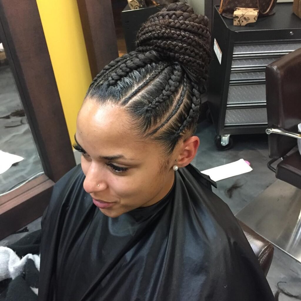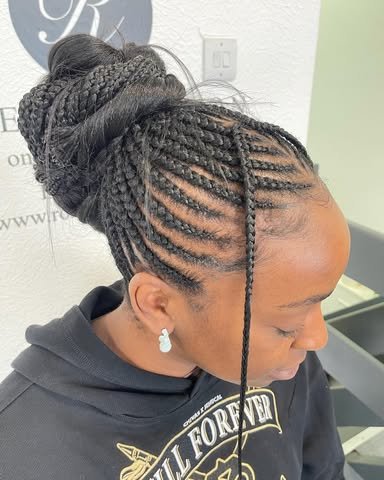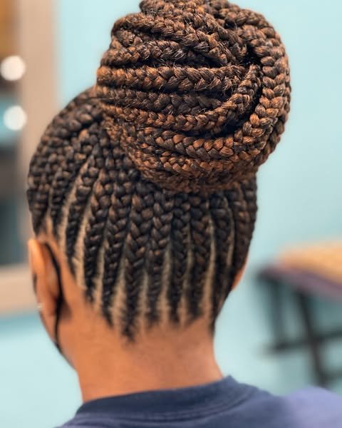 Turn heads wherever you go with this timeless cornrow bun that blends elegance and culture. Perfect for casual days or formal nights, this hairstyle keeps your braids neat while framing your face beautifully. A go-to look for confidence and class!