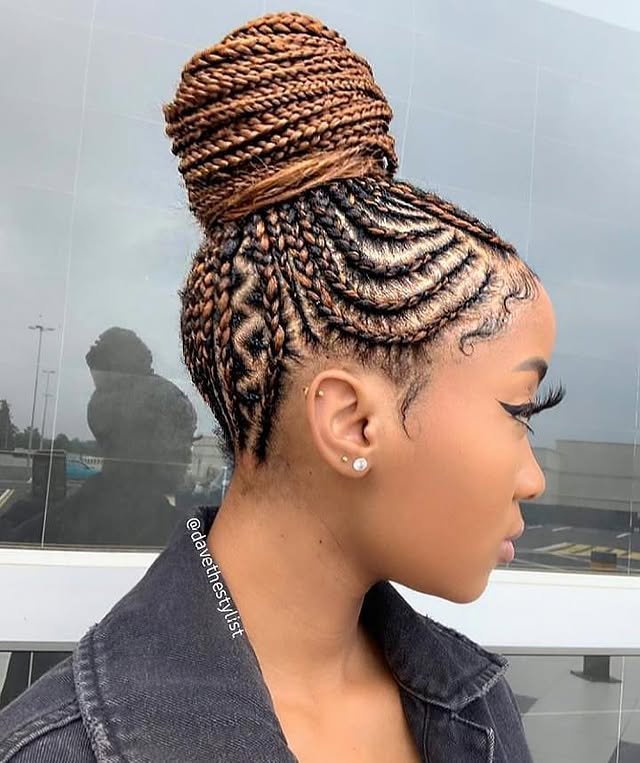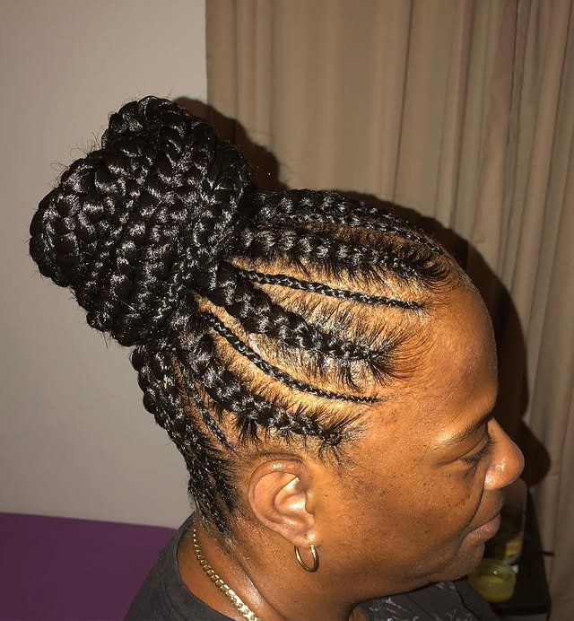 If you love understated elegance, this low cornrow bun is your match. It’s simple, comfortable, and incredibly stylish. Whether you’re dressing up or keeping it casual, this hairstyle exudes quiet confidence and natural beauty.