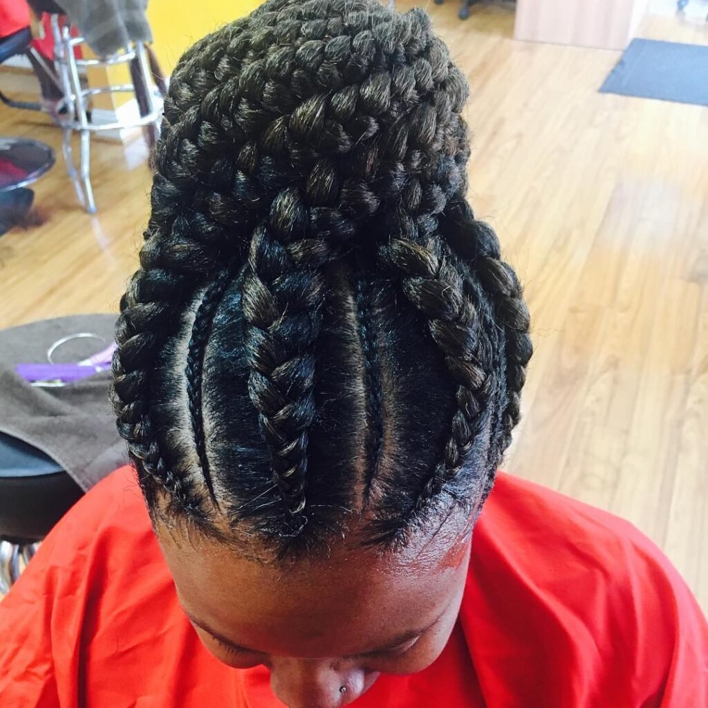 Make a powerful statement with jumbo cornrows styled into a high bun. This hairstyle radiates strength and confidence, giving you a fierce yet feminine look. It’s bold, beautiful, and made to be noticed!