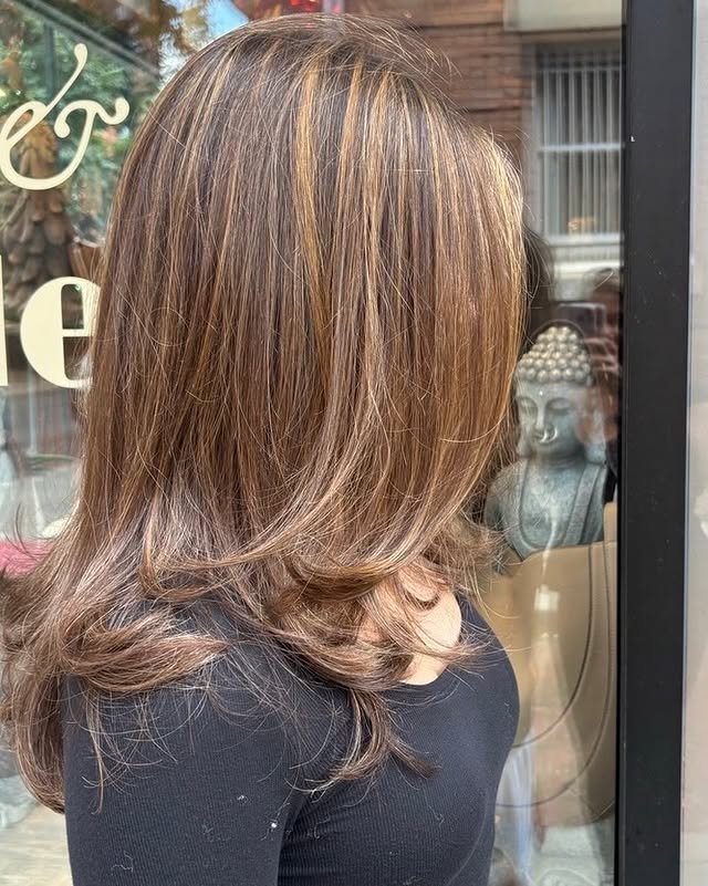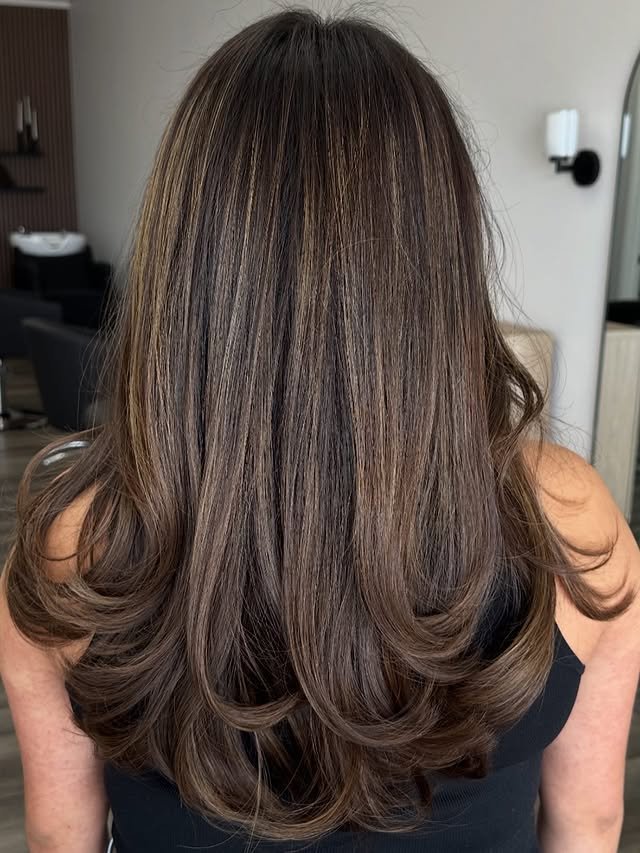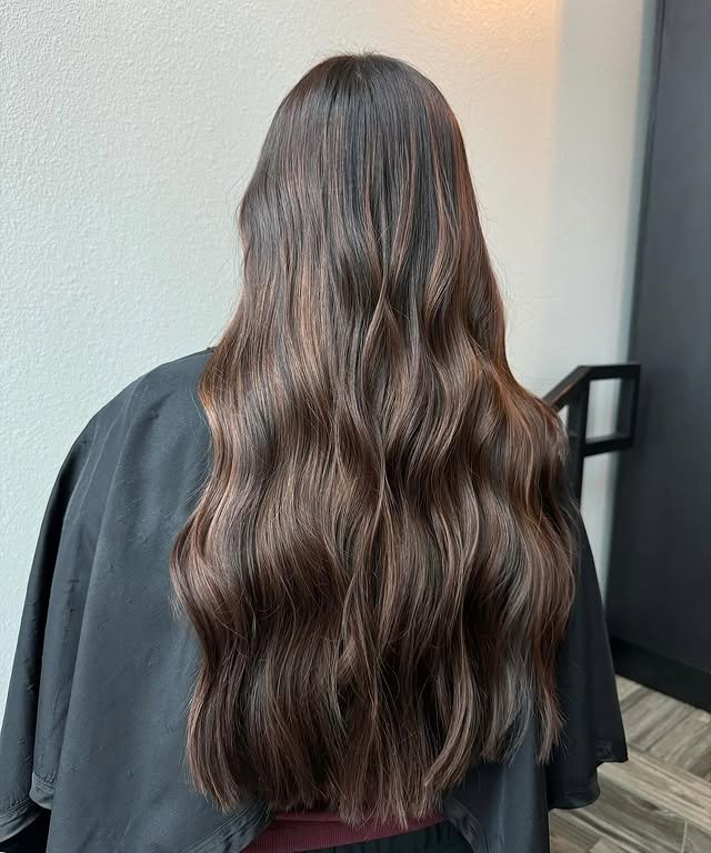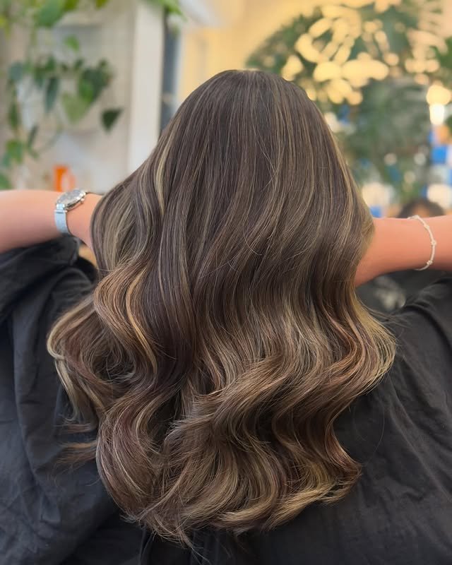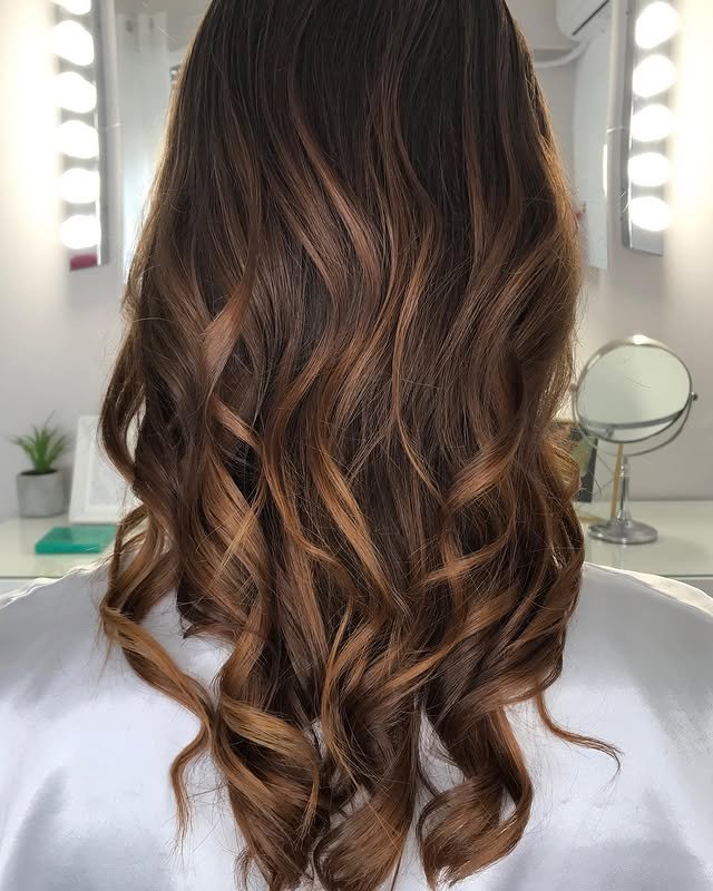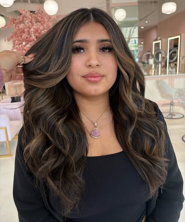Balayage in chocolate brown and caramel adds seamless dimension. The hand-painted highlights look effortless and trendy. It’s a low-maintenance choice with high-fashion appeal.
