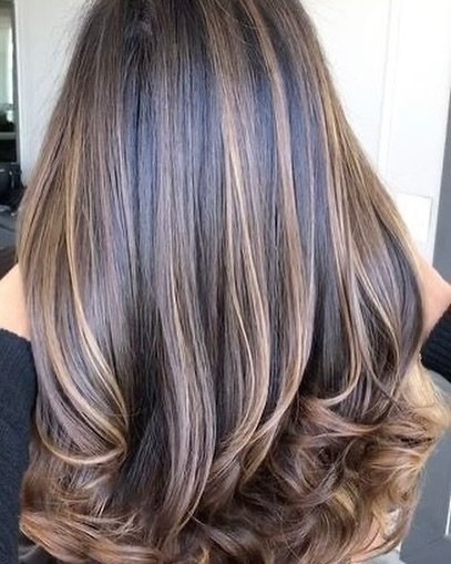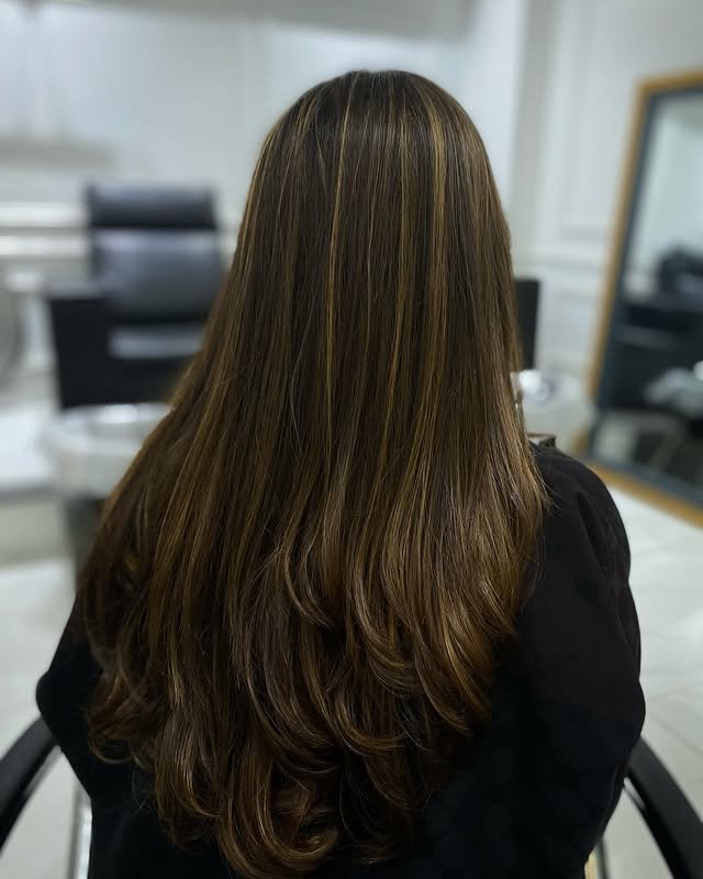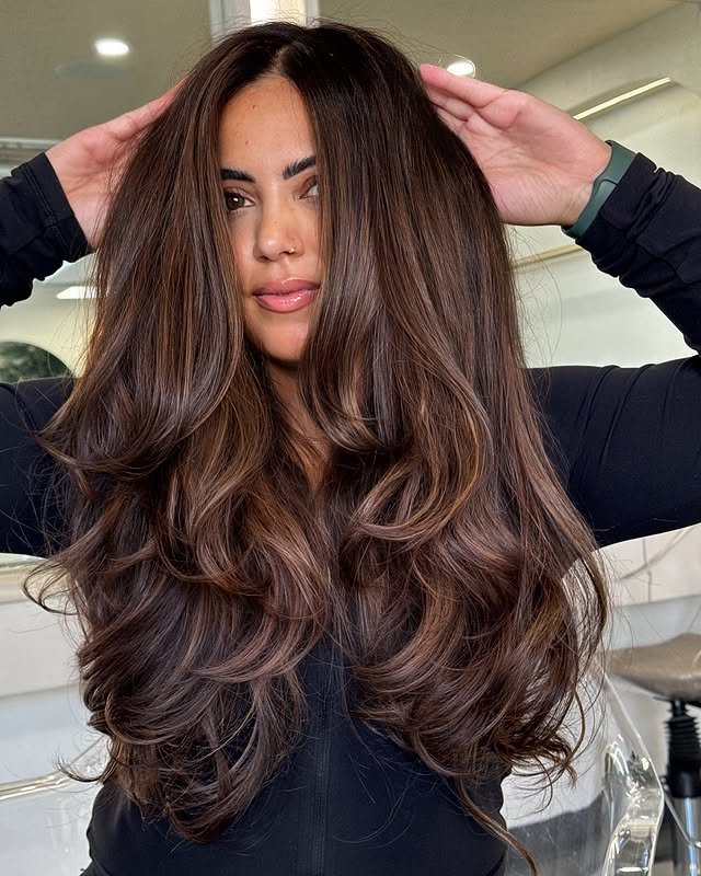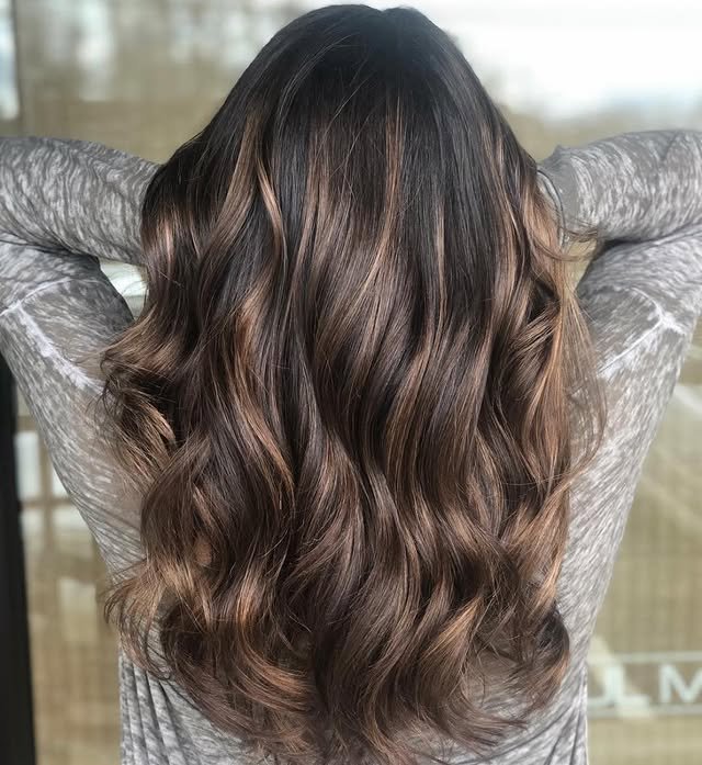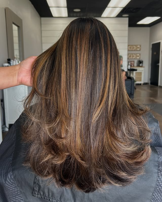 Chocolate brown hair looks even more radiant with soft caramel highlights. The warm tones create a natural sun-kissed effect. This style is perfect for adding brightness without losing depth.