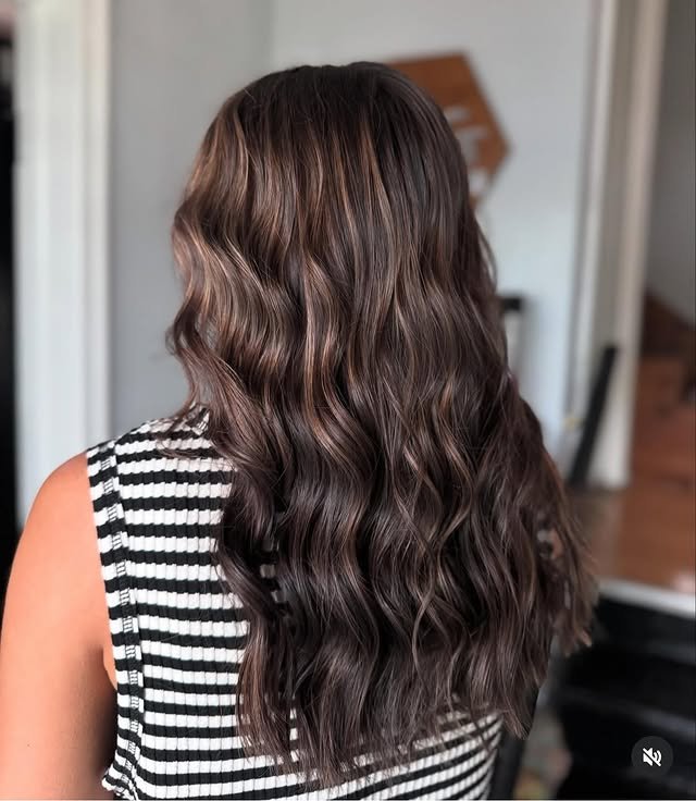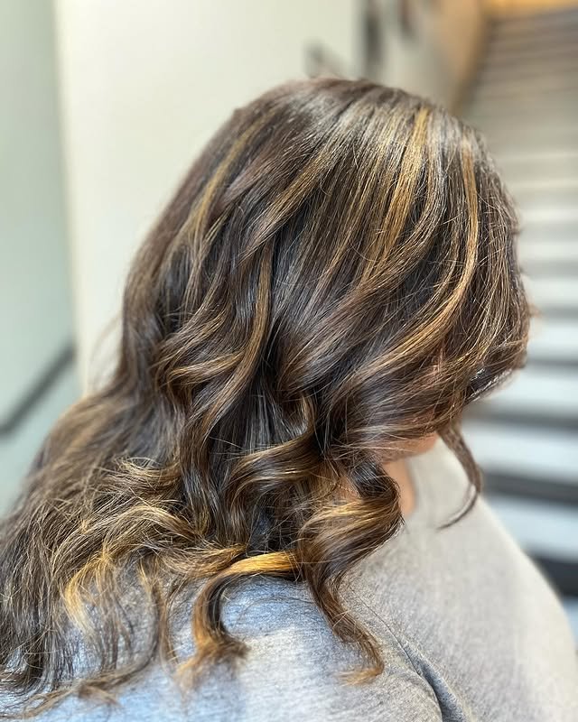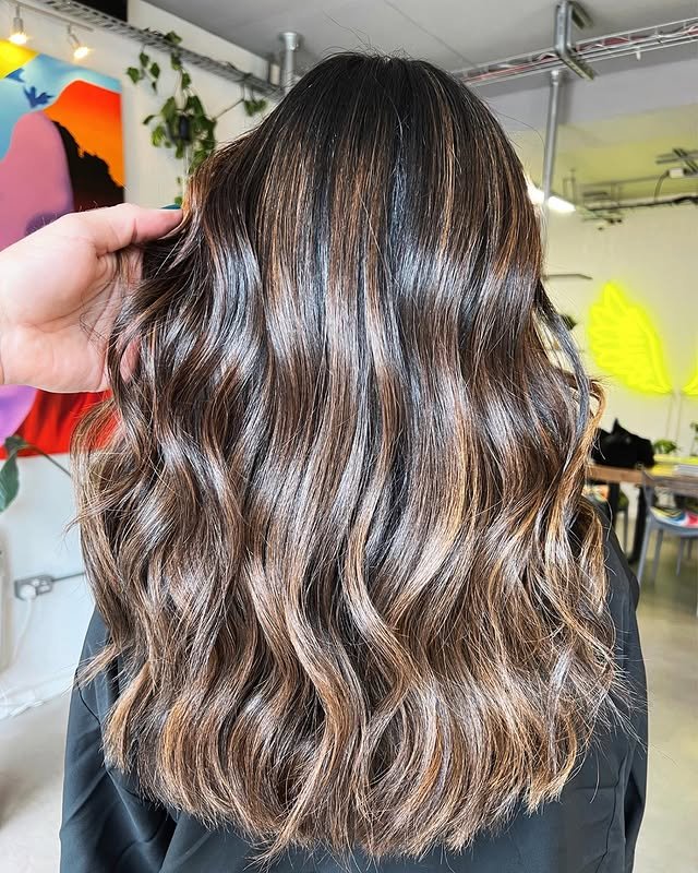 Waves bring out the beauty of chocolate brown hair with caramel streaks. The movement highlights the blend of shades for a playful yet chic look. It’s a perfect choice for everyday glamour.
