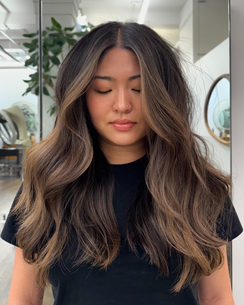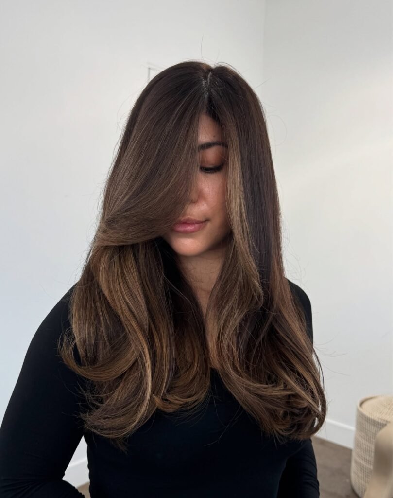 A balayage with warm caramel tones adds depth and dimension while keeping a natural, lived-in style. Perfect for low-maintenance beauty.