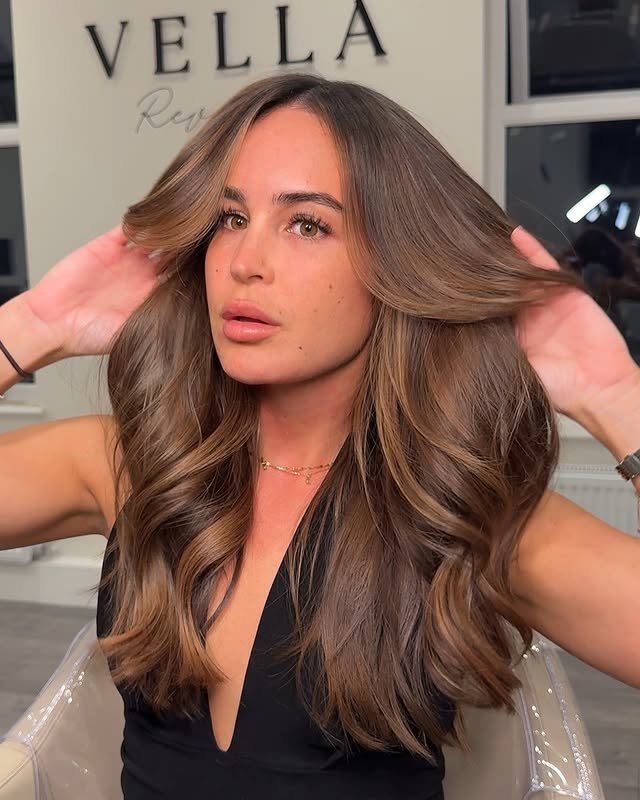 Rich honey tones blended through dark brunette hair create a glowing, natural look. It’s the perfect choice for those wanting a subtle yet noticeable transformation.
