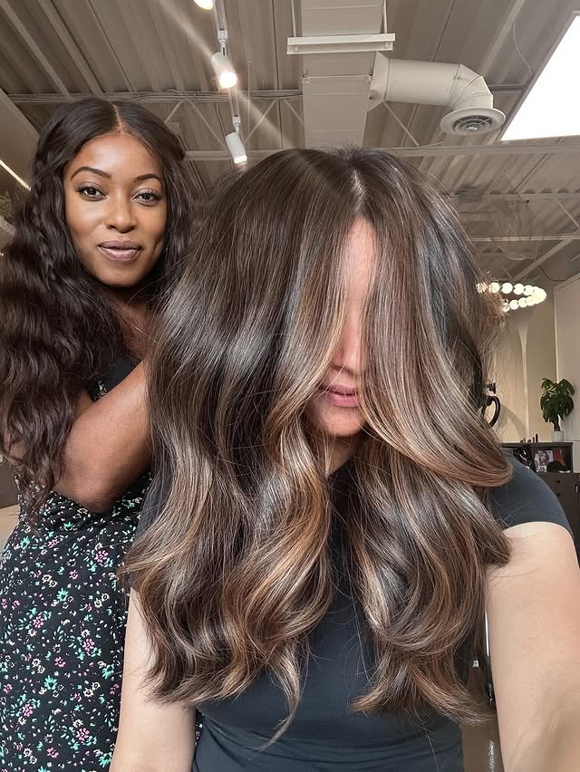 Warm toffee tones enhance the richness of chocolate brown hair. The blend is both cozy and luxurious, perfect for a timeless look.