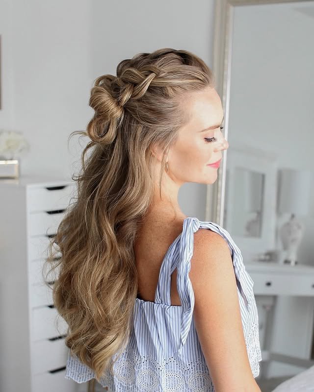 Add charm with a half-up Dutch braid. It combines the elegance of braids with the freedom of loose hair. This style is flirty, youthful, and easy to achieve.
