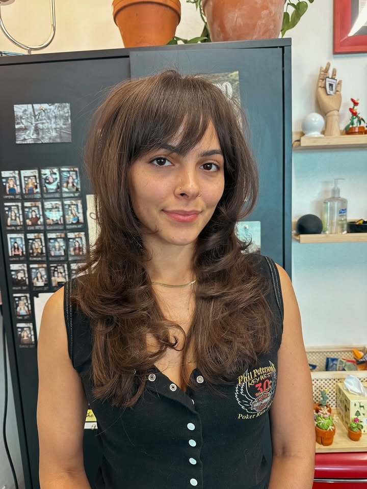 Sometimes, all it takes is a little fringe magic! These side swept bangs add volume, balance, and movement. A simple tweak for an effortlessly chic transformation.